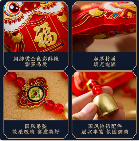 Décoration à suspendre, avec petites cloches, à l'effigie de la Danse du Lion. Caractère bonheur sur la poitrine Dimensions : 15.5*36cm